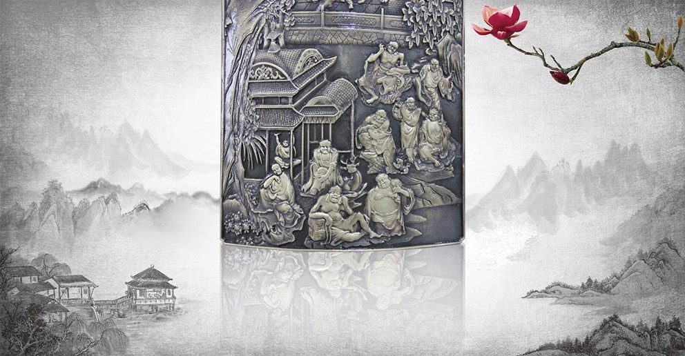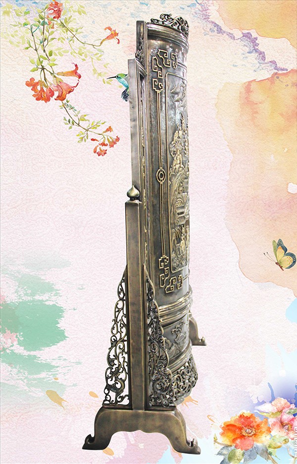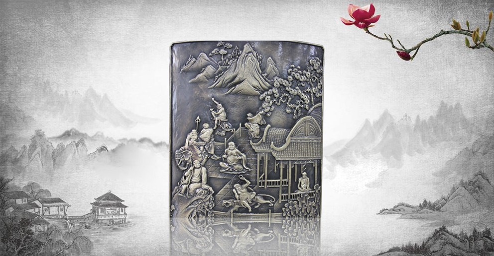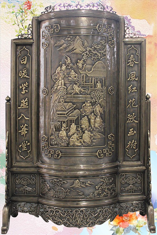 此幅青銅鑄造的《十八羅漢插屏》,是從一友人收藏的大約清中期紅木插屏上翻模制成的。整體上看玲瓏天成,布局精巧。從工藝上看雕法嫻熟,匠心獨(dú)具。特別是十八羅漢,個(gè)個(gè)活靈活現(xiàn)、栩栩如生。作者通過板塊錯(cuò)落的布局,使畫面生動(dòng)起來,產(chǎn)生了上乘的視覺效果。